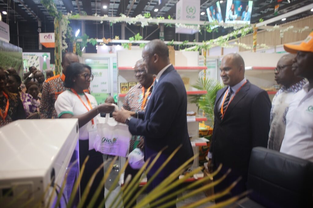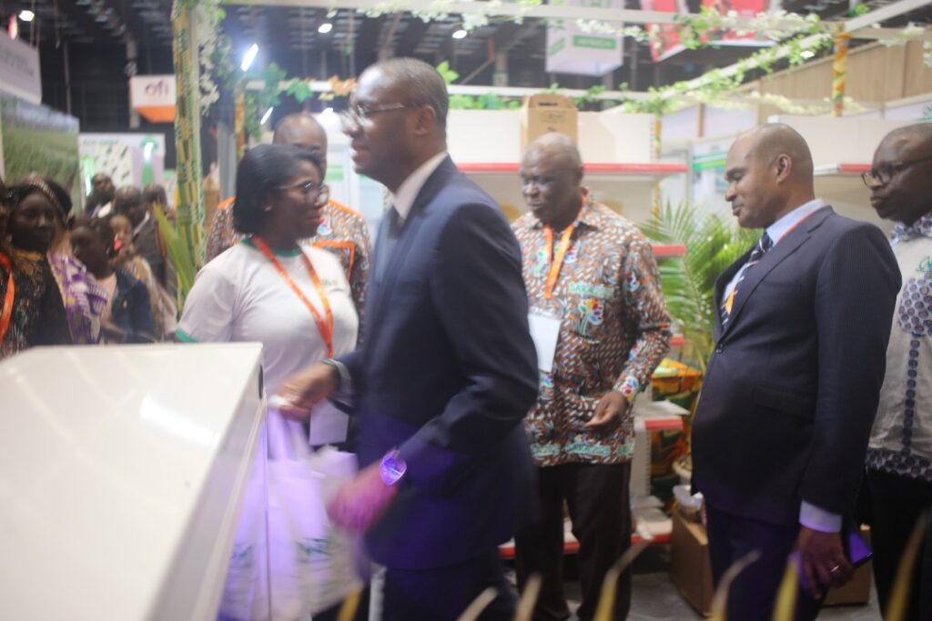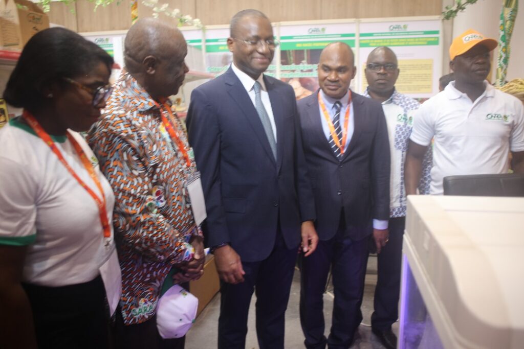 Le ministre des Ressources animales et halieutiques de Côte d’Ivoire, M. Sidi Tiémoko Touré, visite le stand du CNRA le 27 mai 2025. Le DREG-Bouaké, Dr Kouassi Cyrille, et la CSCI, Mme Ehounou Bienvenue, l’ont reçu et lui ont offert un cadeau symbolique au nom du DG, Prof. Sangaré Abdourahamane.